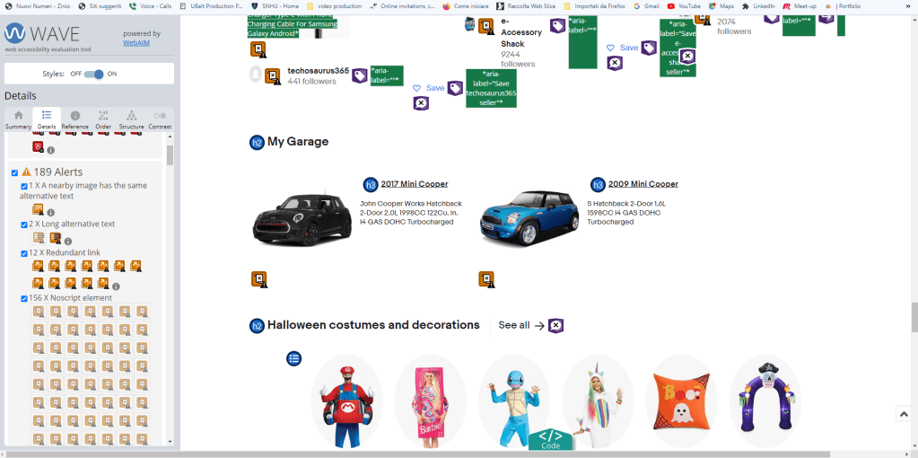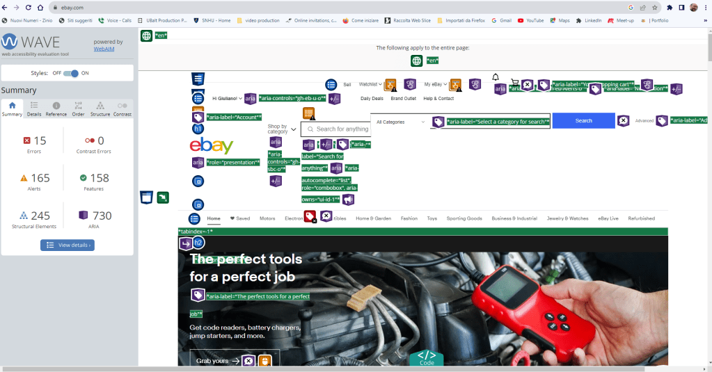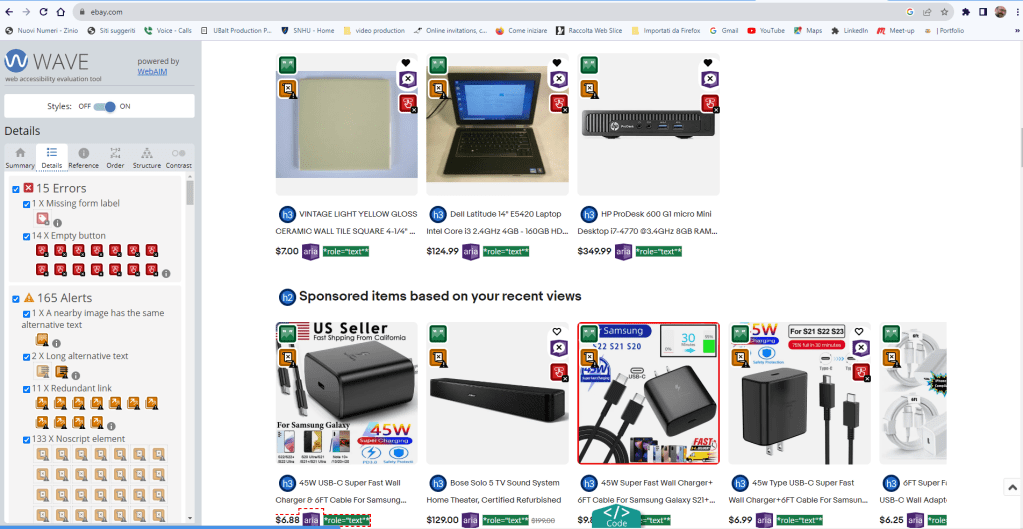 eBay is probably one of the most clicked online stores worldwide, and it surprised me to see how the Wave evaluation revealed 15 errors and 165 alerts on its home page. Here, I am going to analyze a few errors as many repeat themselves, and how we might fix them.
